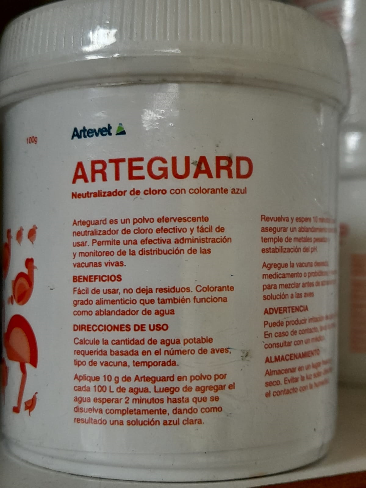Es un polvo efervescente neutralizador de cloro, efectiva y fácil de usar. La tableta también permite una efectiva administración y monitoreo de la distribución de vacunas vivas. Fácil de usar, no deja residuos. Neutraliza hasta 5 ppm de cloro en el agua. Colorante grado alimenticio que también funciona como ablandador de agua.